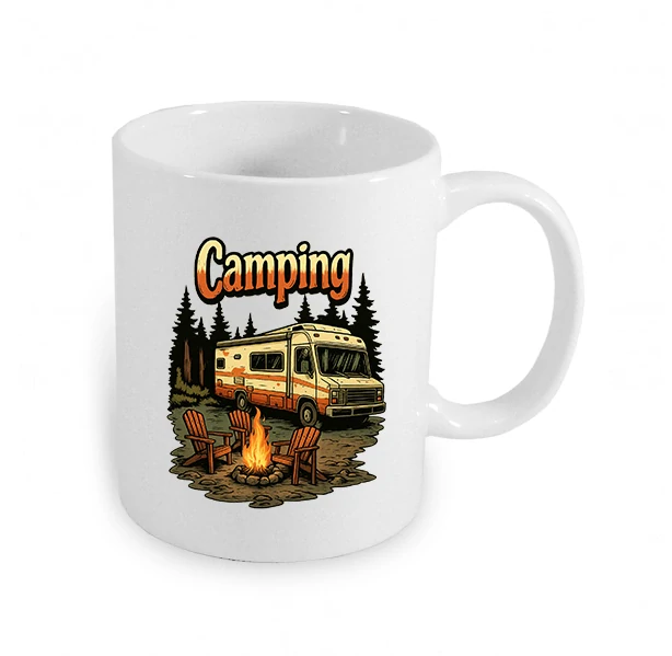 Tenhle hrnek zachycuje přesně ten moment – karavan zaparkovanej uprostřed lesa, oheň plápolá, židle čekají… a ty si naléváš ranní dávku svobody.