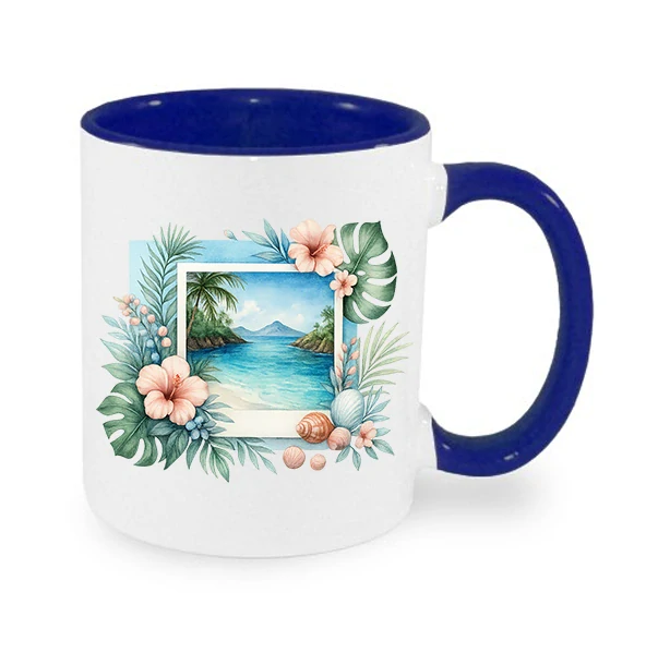 Přeneste se každým lokem do exotického ráje! Tento nádherný hrnek spojuje letní pohodu s romantikou tropických květin a mořské krajiny. Rámeček jako z polaroidové fotky ukazuje ideální místo k útěku od reality.