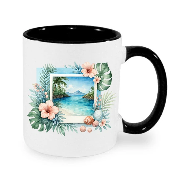 Přeneste se každým lokem do exotického ráje! Tento nádherný hrnek spojuje letní pohodu s romantikou tropických květin a mořské krajiny. Rámeček jako z polaroidové fotky ukazuje ideální místo k útěku od reality.