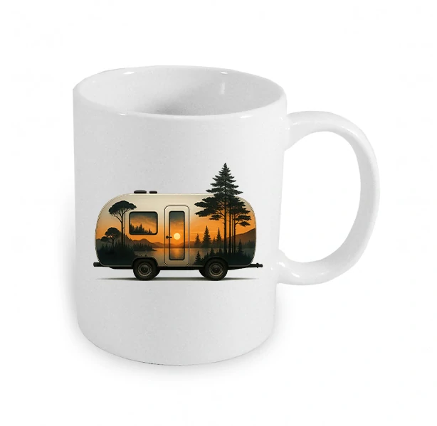 Tenhle hrnek je jako roadtrip zalitý sluncem – v každém doušku ucítíš volnost, dálku a svobodu. Stylová silueta karavanu s krajinou západu slunce se skvěle vyjímá na bílém podkladu se žlutým ouškem a vnitřkem.